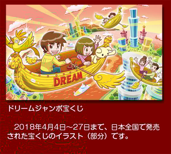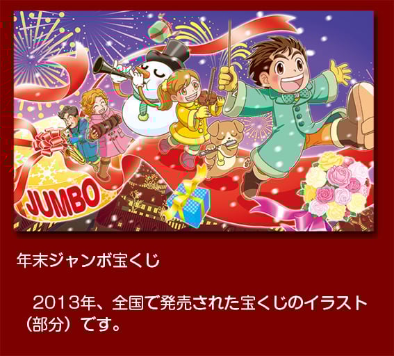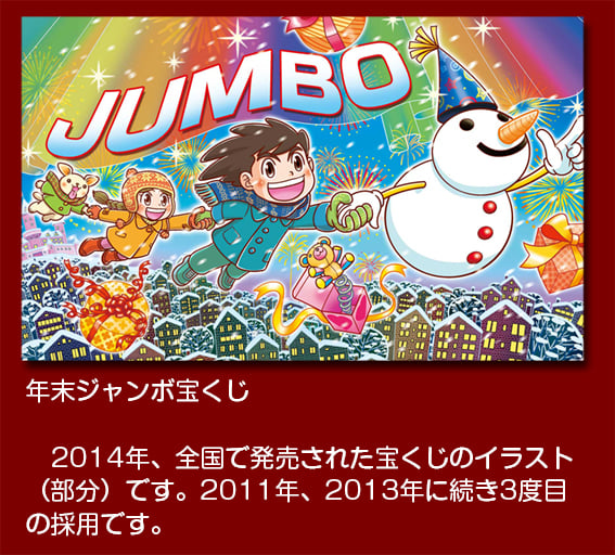 「ジャンボ宝くじ」は、日本全国で発売される宝くじです。一年に5種類発売されます。これまでにグリーンジャンボ、ドリームジャンボ、サマージャンボ、オータムジャンボ、年末ジャンボすべてのイラストを描かせていただきました。(2017年以降はオータムジャンボはハロウィンジャンボに変わり、2018年からグリーンジャンボはバレンタインジャンボに変わり、装いを新たにしています)